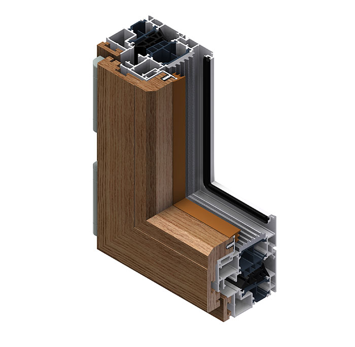 L’isolamento termico è conseguito tramite listelli in poliammide PA 6.6 con fibra di vetro al 25%, di altezza pari a mm 30 (Altas 65 Wood) e mm 39 (Magnum 74 Wood). Il sistema di tenuta è a giunto aperto, con guarnizione centrale in EPDM e angoli vulcanizzati in EPDM.